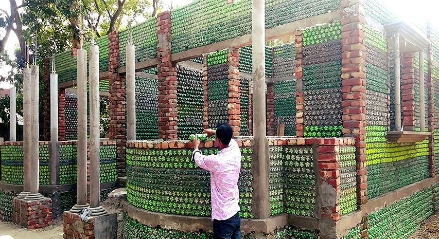 পেশায় ট্রাফিক পুলিশ সদস্য শফিকুল ইসলামের প্লাস্টিকের বোতল দিয়ে নির্মাণাধীন বাড়িটির ছাদ ঢালাইয়ের কাজ বাকি থাকলেও এরই মধ্যে এলাকায় আলোচনার কেন্দ্রবিন্দুতে পরিণত হয়েছে।